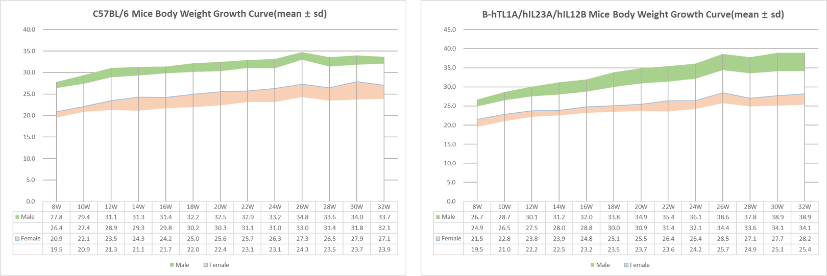 Growth curve of wild-type C57BL/6 and B-hTL1A/hIL23A/hIL12B mice. 8-week-old mice were grouped (10 males and 10 females, respectively). Body weight was measured on the same day of every two week, until 32 weeks. The lowest and highest values of mouse body weight in the table were calculated from the mean ± SD. The growth curve of the B-hTL1A/hIL23A/hIL12B mice was similar to the growth curve of C57BL/6 mice.