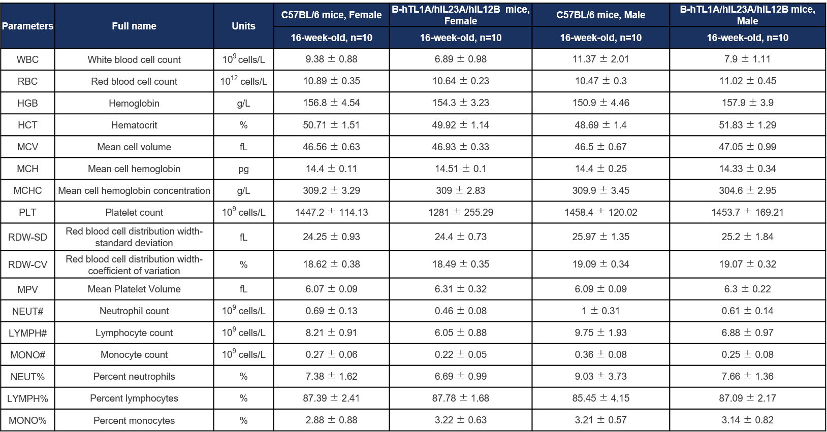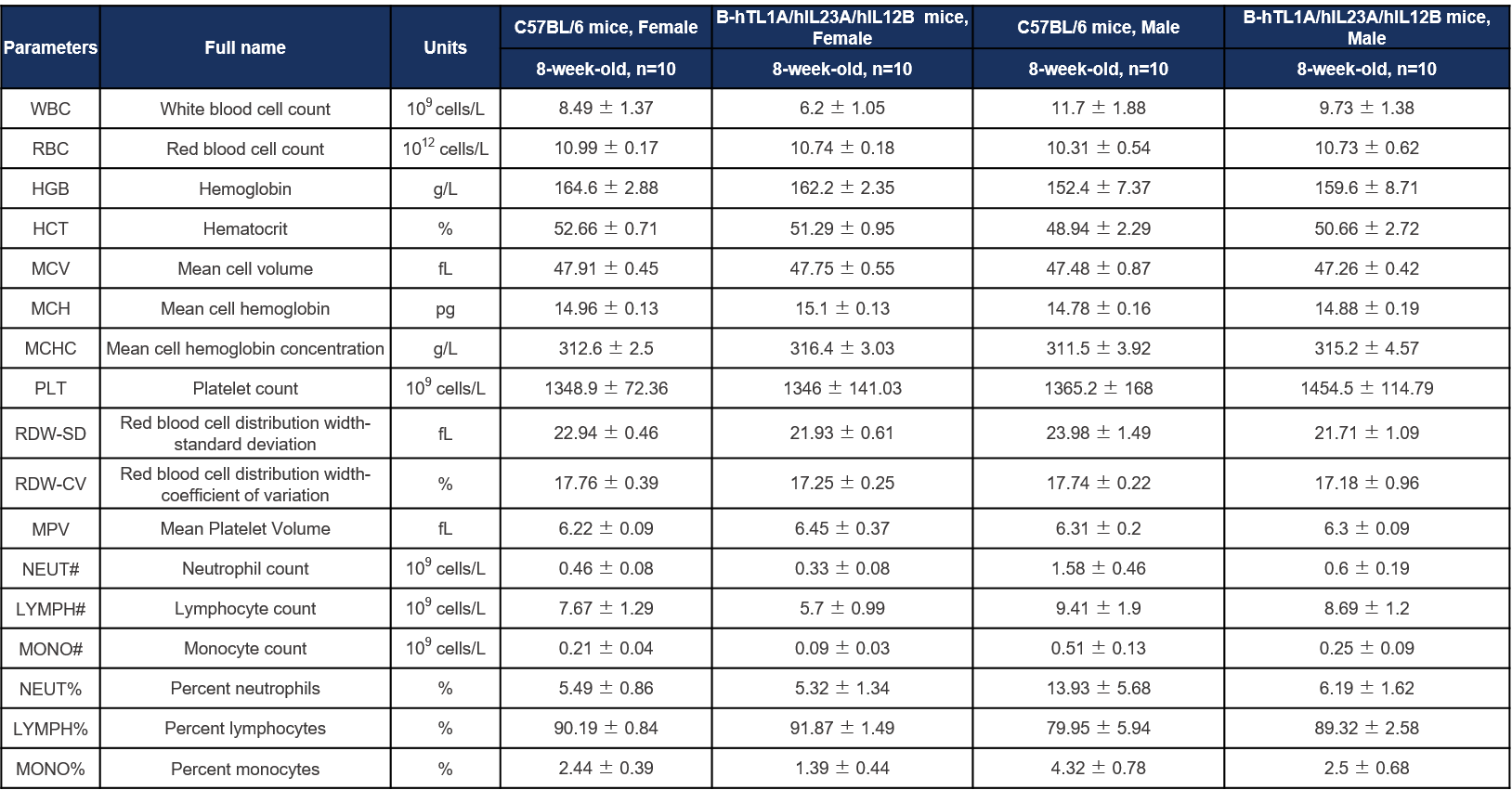 Complete blood count (CBC) of B-hTL1A/hIL23A/hIL12B mice. Values are expressed as mean ± SD.