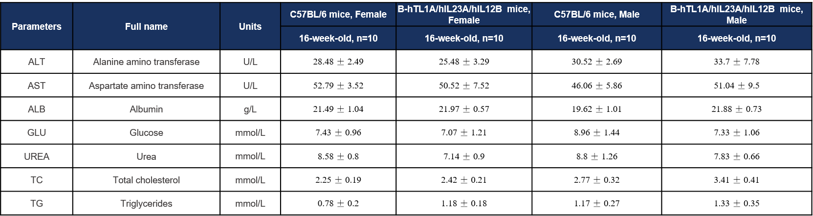 Biochemical test of B-hTL1A/hIL23A/hIL12B mice. Values are expressed as mean ± SD.