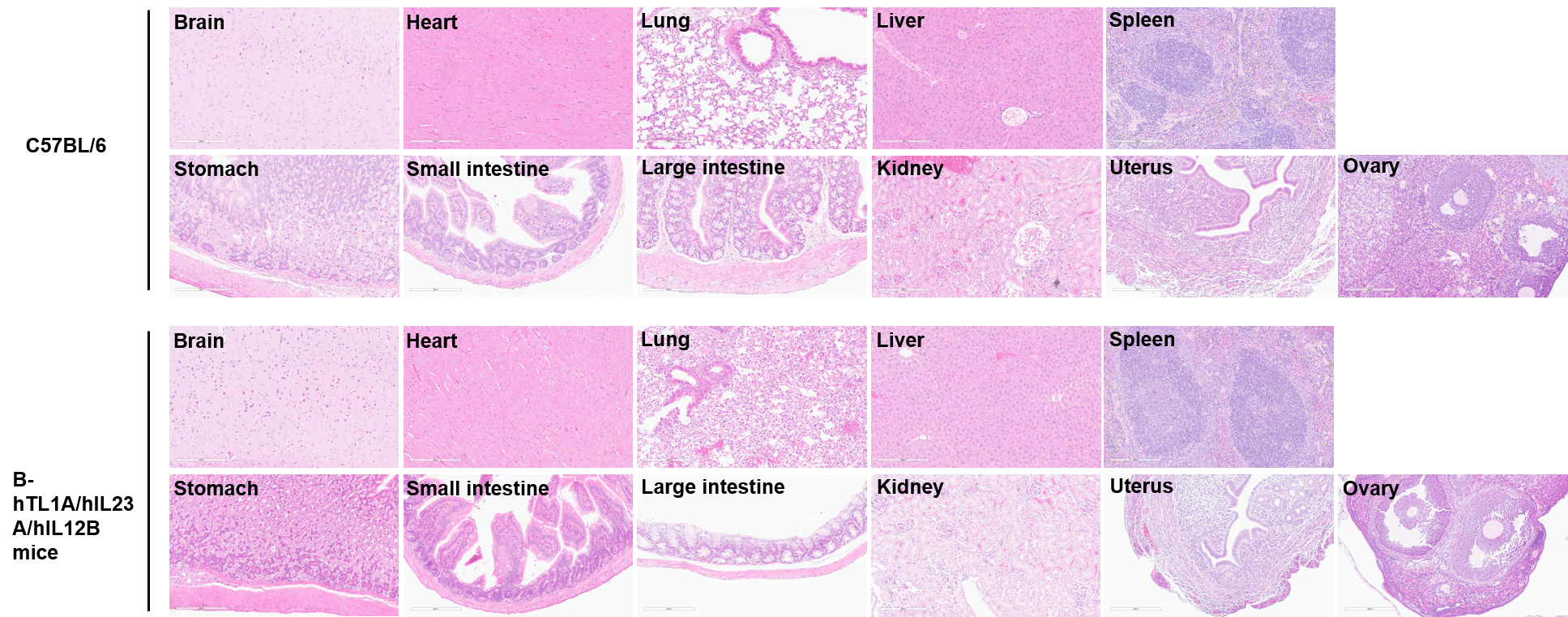 Histopathological analysis of organs in female C57BL/6 and B-hTL1A/hIL23A/hIL12B mice. The main organs of C57BL/6 and B-hTL1A/hIL23A/hIL12B mice were isolated at 32 weeks of age and analyzed with H&E staining (female, n=3). Results showed that no obvious abnormalities were found in all of the organs (brain, heart, lung, liver, spleen, stomach, small intestine, large intestine, kidney, uterus and ovary).