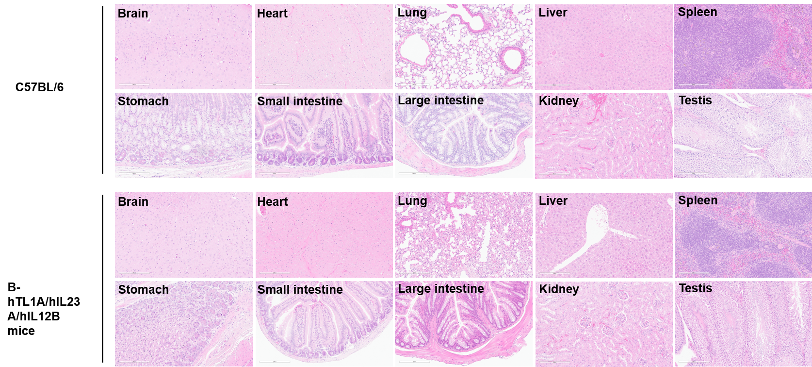 Histopathological analysis of organs in male C57BL/6 and B-hTL1A/hIL23A/hIL12B mice. The main organs of C57BL/6 and B-hTL1A/hIL23A/hIL12B mice were isolated at 32 weeks of age and analyzed with H&E staining (male, n=3). Results showed that no obvious abnormalities were found in all of the organs (brain, heart, lung, liver, spleen, stomach, small intestine, large intestine, kidney, and testis).