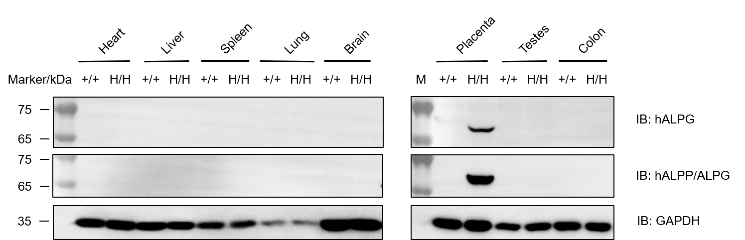 Western blot analysis of ALPG and ALPP protein expression in homozygous B-hALPG/hALPP mice. Various tissue lysates were collected from wild-type C57BL/6JNifdc mice (+/+) and homozygous B-hALPG/hALPP mice (H/H), and then analyzed by western blot with anti-ALPG antibody (Proteintech, 84813-1-RR) and anti-human ALPP/ALPG antibody (abcam, ab133602). 40 μg total proteins were loaded for western blotting analysis. GAPDH was detected as an internal control. Human ALPG and ALPP protein were exclusively detectable in placenta from homozygous B-hALPG/hALPP mice, but not from wild-type C57BL/6JNifdc mice. M, marker.