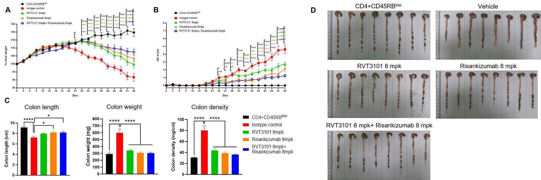CD4+CD45RBlow T and CD4+CD45RBhigh T cells were isolated from the spleens of B-hIL23A/hIL12B/hIL23R/hIL12RB1 mice. B-hTL1A/hIL23A/hIL12B, Rag2 KO mice in group G1 were injected with CD4+CD45RBlow T cells, while B-hTL1A/hIL23A/hIL12B, Rag2 KO mice in groups G2-G5 were injected with CD4+CD45RBhigh T cells. The treatment groups received anti-TL1A antibody RVT3101 (8 mpk, provided by WuXi AppTec), anti-human IL23p19 antibody Risankizumab (8 mpk, providedby WuXi AppTec) alone or in combination every three days. (A) Body weight change. (B) DAI score. (C) Colon index. (D) Colon photo. Administration of anti-TL1A antibody RVT3101 and anti-human IL23p19 antibody Risankizumab effectively improved T cells transfer induced colitis, and their combination provided better efficacy. Two-way ANOVA or one-way ANOVA was used for multiple comparisons, with each group compared to Vehicle. Values are expressed as mean ± SEM. *p<0.05, **p<0.01, ***p<0.001, ****p<0.0001.