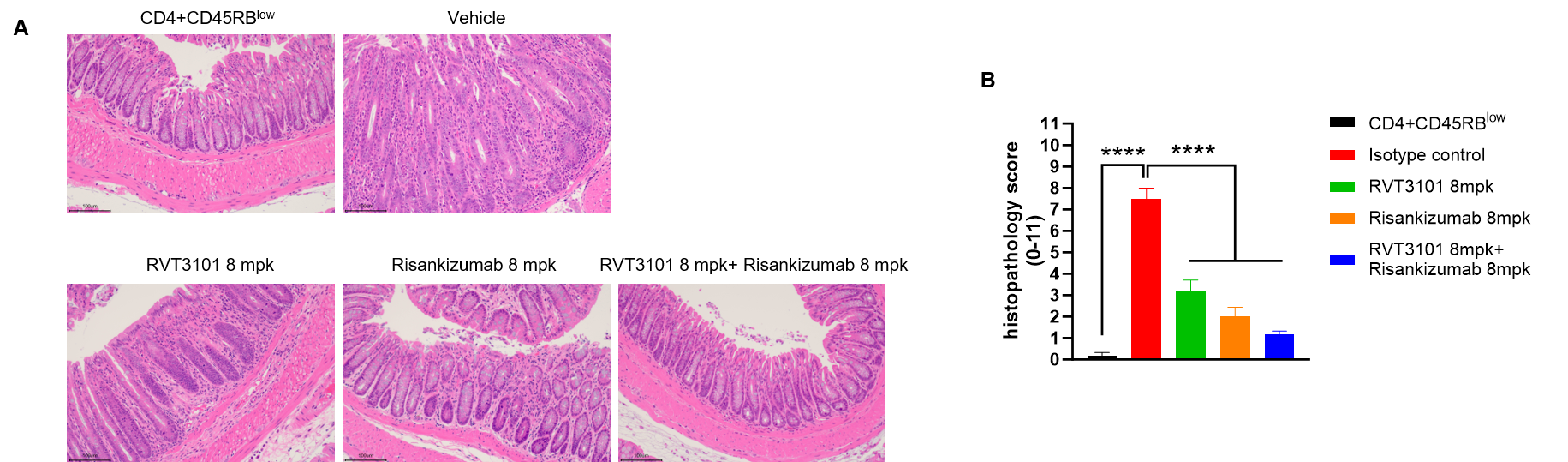 CD4+CD45RBlow T and CD4+CD45RBhigh T cells were isolated from the spleens of B-hIL23A/hIL12B/hIL23R/hIL12RB1 mice. B-hTL1A/hIL23A/hIL12B, Rag2 KO mice in group G1 were injected with CD4+CD45RBlow T cells, while B-hTL1A/hIL23A/hIL12B, Rag2 KO mice in groups G2-G5 were injected with CD4+CD45RBhigh T cells. The treatment groups received anti-TL1A antibody RVT3101 (8 mpk, provided by WuXi AppTec), anti-human IL23p19 antibody Risankizumab (8 mpk, providedby WuXi AppTec) alone or in combination every three days. (A) H&E staining of colon tissue. (B) Pathological score. Administration of anti-TL1A antibody RVT3101 and anti-human IL23p19 antibody Risankizumab effectively improved T cells transfer induced colitis, and their combination provided better efficacy. One-way ANOVA was used for multiple comparisons, with each group compared to Vehicle. Values are expressed as mean ± SEM. *p<0.05, **p<0.01, ***p<0.001, ****p<0.0001.