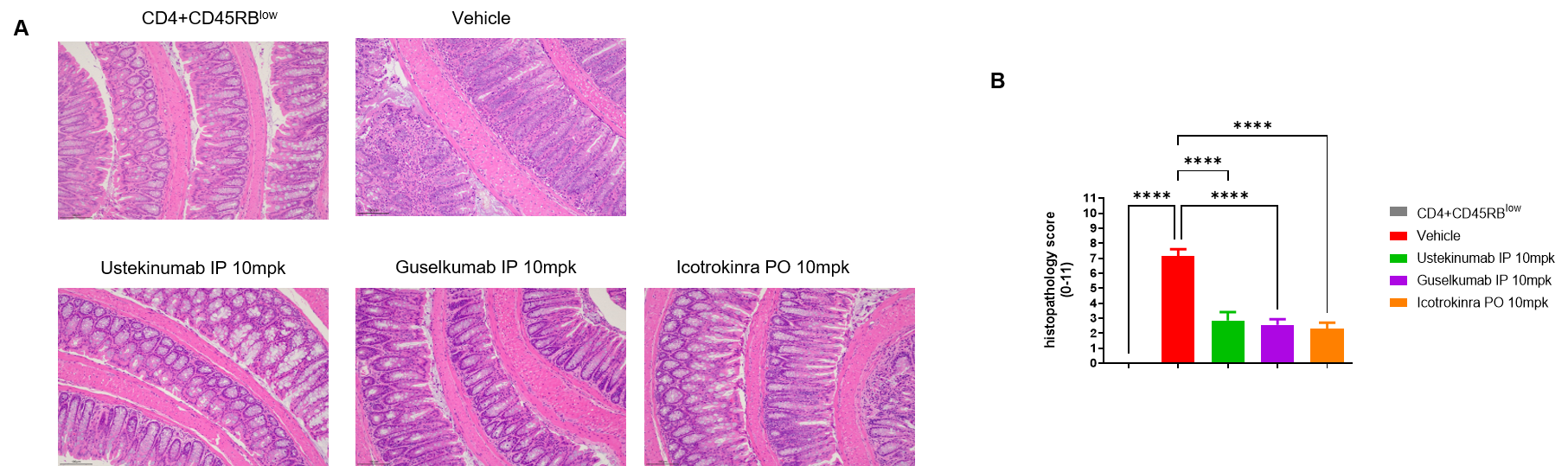 CD4+CD45RBlow T and CD4+CD45RBhigh T cells were isolated from the spleens of B-hIL23R/hIL12RB1 plus mice. B-hIL23A/hIL12B, Rag2 KO mice in group G1 were injected with CD4+CD45RBlow T cells, while B-hIL23A/hIL12B, Rag2 KO mice in groups G2-G5 were injected with CD4+CD45RBhigh T cells. The treatment groups received anti-human IL12/IL23p40 antibody Ustekinumab (10 mpk, provided by WuXi AppTec), anti-human IL23p19 antibody Guselkumab (10 mpk, provided by WuXi AppTec) and anti-human IL23R oral peptide Icotrokinra (10 mpk, provided by WuXi AppTec). (A) H&E staining of colon tissue. (B) Pathological score. Administration of anti-human IL12/IL23p40 antibody Ustekinumab, anti-human IL23p19 antibody Guselkumab and anti-human IL23R oral peptide Icotrokinra effectively improved T cells transfer induced colitis. Two-way ANOVA or one-way ANOVA was used for multiple comparisons, with each group compared to Vehicle. Values are expressed as mean ± SEM. *p<0.05, **p<0.01, ***p<0.001, ****p<0.0001.