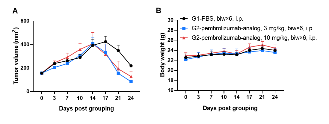 Antitumor activity of anti-human PD-1 antibody pembrolizumab analog (in-house) in breast cancer cell line MDA-MB-231 CDX model established with huPBMC-B-NDG hIL15, FcγR KO mice. Human PBMCs (5×106) were intravenously engrafted into B-NDG hIL15, FcγR KO mice. On the same day, MDA-MB-231 cells (1×107) were subcutaneously inoculated into B-NDG hIL15, FcγR KO mice. Mice were grouped when the tumor volume reached approximately 100-150 mm3, at which time they were treated intraperitoneally with pembrolizumab analog with doses and schedule indicated in panel (female, 7-week-old, n=6). The results showed that pembrolizumab analog could effectively inhibit tumor growth in the breast cancer CDX model established with huPBMC-B-NDG hIL15, FcγR KO mice. Values are expressed as mean ± SEM.