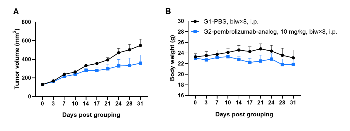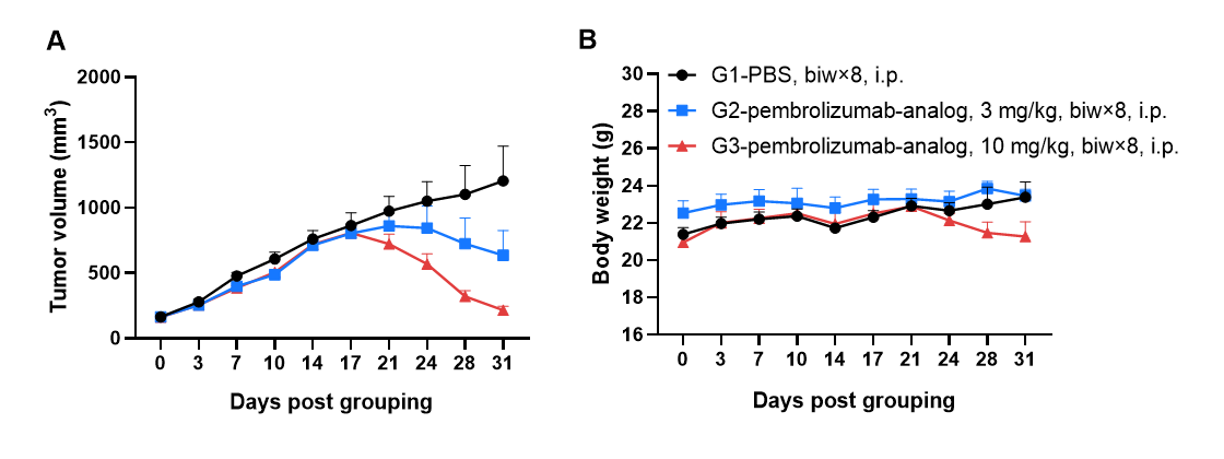 Antitumor activity of anti-human PD-1 antibody pembrolizumab analog (in-house) in lung adenocarcinoma cell line HCC827 CDX model established with huPBMC-B-NDG hIL15, FcγR KO mice. HCC-827 cells (1.5×107) were subcutaneously inoculated into B-NDG hIL15, FcγR KO mice. Mice were grouped when the tumor volume reached approximately 150 mm3, at which time they were intravenously engrafted human PBMCs (5×106) and treated intraperitoneally with pembrolizumab analog with doses and schedule indicated in panel (female, 7-week-old, n=6). The results showed that pembrolizumab analog could effectively inhibit tumor growth in lung cancer CDX model established with huPBMC-B-NDG hIL15, FcγR KO mice. Values are expressed as mean ± SEM.